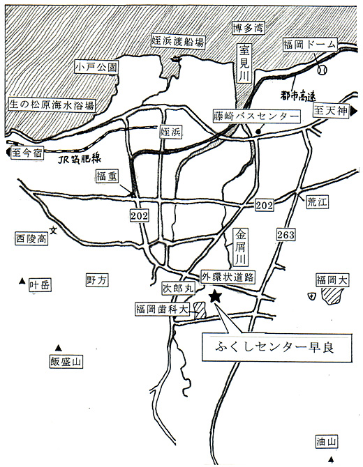 福重出口が合流する外環状道路を直進(道なりに進み)し、室見(むろみ)川を渡った4つ目の「次郎丸中学東交差点」を右折後、すぐに左に入った先を直進した「田隈新町交差点」右角の手前2軒目。