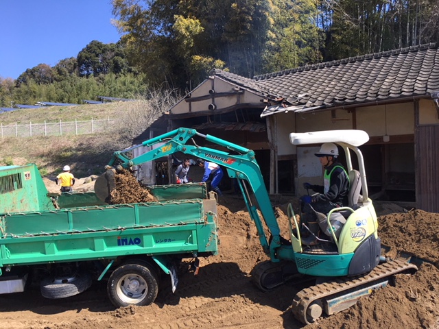 | <土砂のかき出し作業> ・小石原産直がんばろ会生産者宅のビニールハウスの畑の土砂かき出しをチームレスキューとグリーンコープで行いました。 |