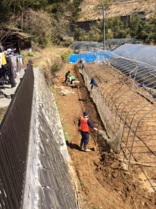 | <小石原産直がんばろ会生産者の土砂かき出し> ・小石原産直がんばろ会生産者のビニールハウスの土砂かき出しを生産者ご夫婦、HAGEMASU隊とグリーンコープで行いました。 ・ビニールハウスの側面の水はけが良くないので、溝を作りました。 |