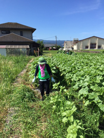 | <林田仮設 ひまわり畑の草取り> ・林田仮設第二農場「ひまわり畑の草取り」を登録ボランティア5名と職員3名で9:00から11:30まで行いました。風の通りもよくなり日も当たるようになりました。現在1m程度の背丈で、1.8m近くまで大きくなると思われます。 ・今後、7月末及び8月中旬、下旬、9月の4回程度の草取りを行い、その後収穫する予定です。 |