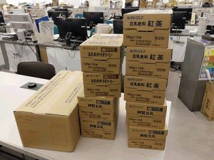 ・本日は、バナナ1箱、お茶6ケース、調整豆乳、豆乳飲料麦芽コーヒー・紅茶、黒酢ドリンク、人参ジュースを各2ケース、りんごジュース、野菜ジュースを各1ケース、ミックスゼリー6袋をお届けしました。
