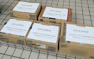 ・生活応援セット5箱、肉まん1袋、ところてん1袋、練り製品3袋、黒酢1箱、豆乳2箱、人参ジュース1箱、アップルシャワー1箱、びん牛乳4本、ちくわ4袋、納豆5個を支援物資としてお届けしました。