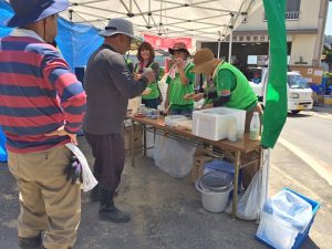 ・今日は約100名くらいのボランティアが集まっており、各グループごとに休憩の際に食べてもらいました。冷たい食べものなのでボランティアの方からとても喜ばれ、たくさんの方から“美味しい”という声をいただきました。また、ボランティアセンターの方も積極的に声がけされて皆さんに食べてもらうことができました。美味しかったので作業している仲間に持って行くという方やおかわりされた方も居られました。