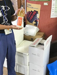 | 【坂町役場】 ・氷15箱、甘酒2ケースをお届けしました。 ・避難所には冷蔵庫もあるので、冷やして飲んでいただければ年配の方にも喜んでいただけるのではないかと思います。 |