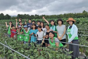 | <産直青果生産者「グリーンあさくら」で収穫体験(朝倉市)> 昨年の九州北部豪雨で大きな被害を受け、さらに今年も大雨により打撃を受けた「グリーンあさくら」ですが、今回のひまわり大使の収穫体験を快く引き受けてくださいました。子どもたちは夕食のバーべキュー用のピーマンとなすを収穫しました。 |