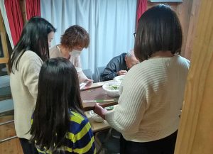 | ・仮設の入居者は23名の参加がありました。みなさんに大好評で「おいしいねー」と笑顔で召し上がられ、60食準備していましたが完食でした。 ・片付けもみんなで行いみんなで集会場を出ました。住民の皆さんと一緒につくり、片付けまで一緒に出来たので「参加型」の支援ができてとても良かったと思いました。次回はバレンタインイベントをより工夫して開催したいと思っています。 |