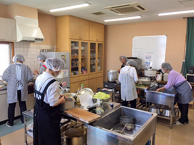 ・本日の当番は、グリーンコープでした。生活再生ワーカーズともにの7名に担っていただきました。とても賑やかに調理されていました。