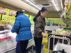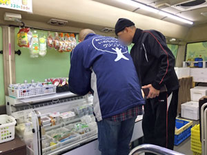・木山東仮設では、毎回訪問して商品をお届けしている高齢の女性の方が、初めて買い物に来られました。トマトや菓子パン、牛乳などを買われ、買い物に来られた方とお茶を飲みながら楽しそうに話をされていました。「来週も元気カーに買い物に来たい」とおっしゃっていました。