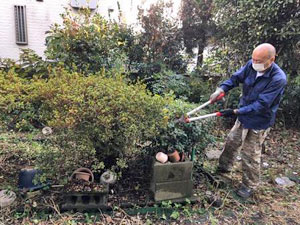 ・月曜日の続きで、外回りの掃除支援に災害支援センタースタッフ2名で行き、庭木の伐採を行ないました。70リットルのゴミ袋に13袋ありました。あと1日ほどかかりそうです。