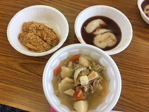 ・もち米は自治会で準備され、合計7回もちをつきました。子ども達も交替でついてとても楽しそうでした。つきあがったもちは老人会の女性の方たちが丸められました。豚汁は150食分用意しました。ついたお餅と豚汁、ぜんざいをみなさんでおいしそうに食べておられました。