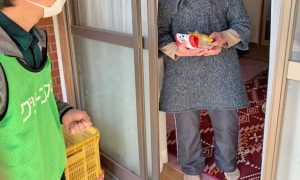 高齢者の一人暮らし世帯で、水害、油被害により自家用車が廃車になり移動手段がなくタクシー券も無くなり、ここ数日買い物にも行けていない様子だったためびん牛乳や冷凍食品などの食料をお届けしました。