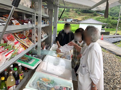90歳位の方が午前中に病院に行かれていたそうで、少し暑さでバテて寝ておられたそうですが、移動販売が来るのを待っていたと起きて出てきてくださいました。りんごジュース、ポテトチップス、カレー、個人商店のお惣菜、豆腐など、色々購入されていました。