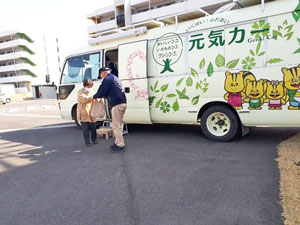 下西原第二団地では、常連の方が3名来られました。特に男性の方は元気カーが来るのを楽しみにされていて、毎週欠かさずに来られ、買い物後に近況をお話しされます。