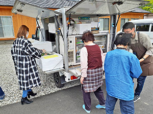 宮園地区では3名の方にご利用いただきました。本日も毎週予約の生乳たっぷりヨーグルトを楽しみに待っておられました。また、先週の友尻地区での炊き出しに来られ、調理をされた方が、牛丼に使った「うまかたれ」を大変気に入られた様子で、購入されました。