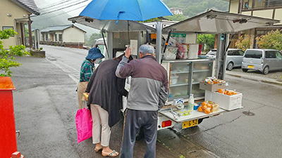 球磨村一勝地友尻地区では、あいにくの雨でしたが、いつもみえる方たちが集まりお買い物されました。一勝地は比較的、家族で住んでらっしゃる方も多く、かなりの高齢者でも自宅で料理をされる方が多い印象です。そのため、野菜(とくに葉物)がよく売れ、お惣菜は「おかずは家にあるから」と敬遠される傾向が感じられます。いつも買い物される高齢の女性も、「食事は自分で作るから」とお惣菜ではなく、食材を買われます。自宅で料理ができる環境であること、一人暮らしでない方は食べる人がいることで料理をする気力もあるようです。一勝地は、住民の方たちのエネルギーが、とても感じられる地域です。