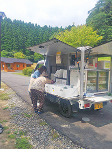 人吉市内2地域、人吉市内の仮設団地7箇所(村山あやめ、村山公園、西間第一、西間第二、石野公園、人吉城跡、梢山)で移動販売を行いました。