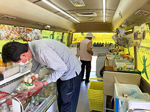 宮園団地では、見守り訪問をしている高齢の女性宅に伺いました。食欲もあり元気な様子に安心しました。新型コロナウイルスワクチン接種の日程も決まったそうで安心されていました。また、常連の方3名が来られました。元気カーの訪問時間がお昼前なので、昼食用にと惣菜や巻き寿司をたくさん購入されます。買い物後に毎回楽しそうにおしゃべりをされています。