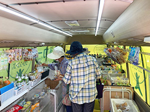 長野地区では、公民館でのワークショップが開催されており、終了後みなさんすぐに買い物に来られました。今日もお昼から近所を散歩される方たちが昼食用にと巻き寿司や惣菜を購入され、巻き寿司はこちらで完売しました。暑くなったせいかアイスクリームを購入される方も多くおられました。