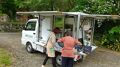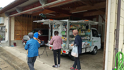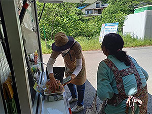 日隠では、腰の悪い方に、家まで訪問して毎週予約の牛乳をお届けしています。今回はその他に玉ねぎやたまごも買われました。買われた商品を見て、「ようやく料理は出来るようになった様だね。」と、ご近所のお友達が安心されているようでした。「元気カーが来る時間だから、畑から駆けつけた。」という女性の方は、梅の実をもいでいたようで、「畑で食べるのにちょうど良い。」とあんパンを購入されていました。また、「おやつ昆布」の大ファンの常連さんが、それをお目当てに来られましたが、あいにく切らしていました。楽しみにされていたようで、残念がられていました。在庫をしっかりチェックして次回は切らさないようにしたいと思います。