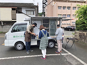 人吉市内2地域、人吉市内の仮設団地6箇所(村山あやめ、村山公園、西間第一、西間第二、石野公園、梢山)で移動販売を行いました。