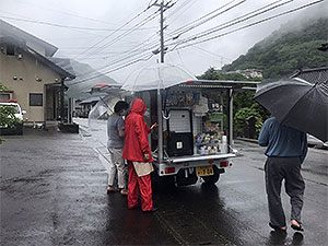 球磨村大瀬地区では、雨が降る中、常連さんが来てくれました。今週買い物に行けなかったからと、牛乳やパン、惣菜、野菜、お刺身などいつもより沢山買われていました。またもう一人の常連さん用に、「牛乳をもう一本」と言われました。