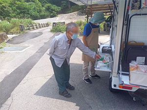 芦北町女島仮設団地では、いつもは配達で利用されている組合員さんが来てくれました。「いつも買えない物が買えて嬉しい。」と、話されていました。ここでは地元の豆腐もとても人気です。仮設住宅のお部屋の縁側から商品をお届けしている、足の悪い女性の方、「日頃から健康に気を遣っています。グリーンコープさんのお陰で欲しい物が買えてとても有難いです。」と言ってくれました。またここの仮設団地に行く途中の道が一昨年の水害の時の土砂崩れでそのままになっている箇所があり、そこの工事が始まるようで、今月の11日から来月いっぱいまで通行止めとなるようです。ここを通れないとなれば、大きく遠回りしてこないとならなくなるので、迂回ルートの検索と時間調整が必要になってきます。