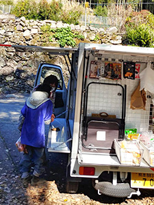 日当地区では、もう一件寄って欲しい所があると教えていただきました。そちらのお宅は、娘さんが町で買い物を済ませて来られるので買い物に困っている訳では無いそうですが、「行ってみたかったけど、足が悪くて日当の停車所まで行けなかったの。」とのことで、パンや惣菜、さしみなどを購入されました。今後立ち寄って欲しい時は、日当でお買い物をされる知人の方に連絡されるそうです。