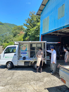 四蔵地区では、「『うちにも寄ってほしい』と、永椎地区の方から電話があったのでこの後に行ってみて」との話があり、向かいました。高齢のご夫婦で、運転免許証を返納されたそうです。果物が好きなんだと、りんごやお惣菜を買われました。