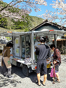 朝から天気も良く汗ばむ陽気でした。友尻地区1件目ではベンチに座りお話をしながら待たれていました。牛乳やお惣菜などお気に入りの商品を買われました。31日は公民館で友尻地区のお花見があるそうで楽しみにされているようでした。