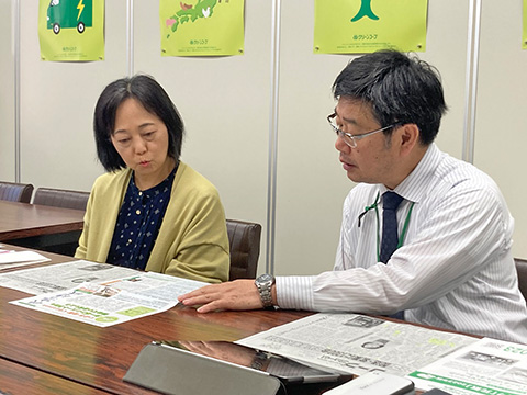 環境をテーマに、グリーンコープのカーボンニュートラルやEV車、そして環境やさしい「せっけん」や耕作放棄地を開拓して育てた小麦で作った「チクゴイズミの素麺」など、グリーンコープ商品についても取材がありました。
