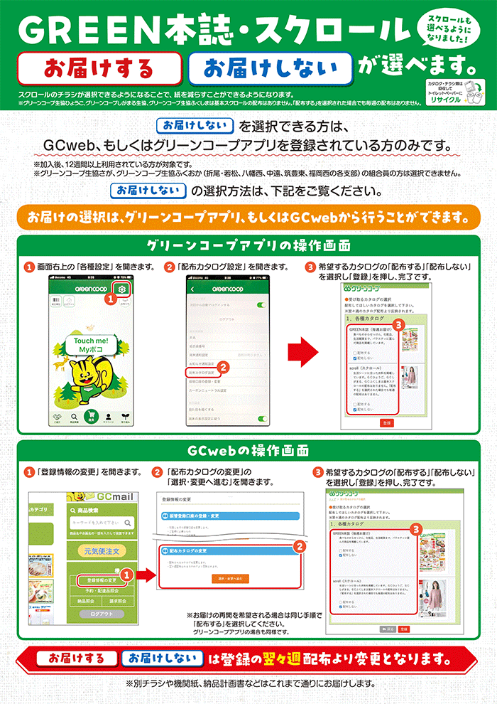 カタログGREEN本誌・スクロールの「お届けする」「お届けしない」が選べます。