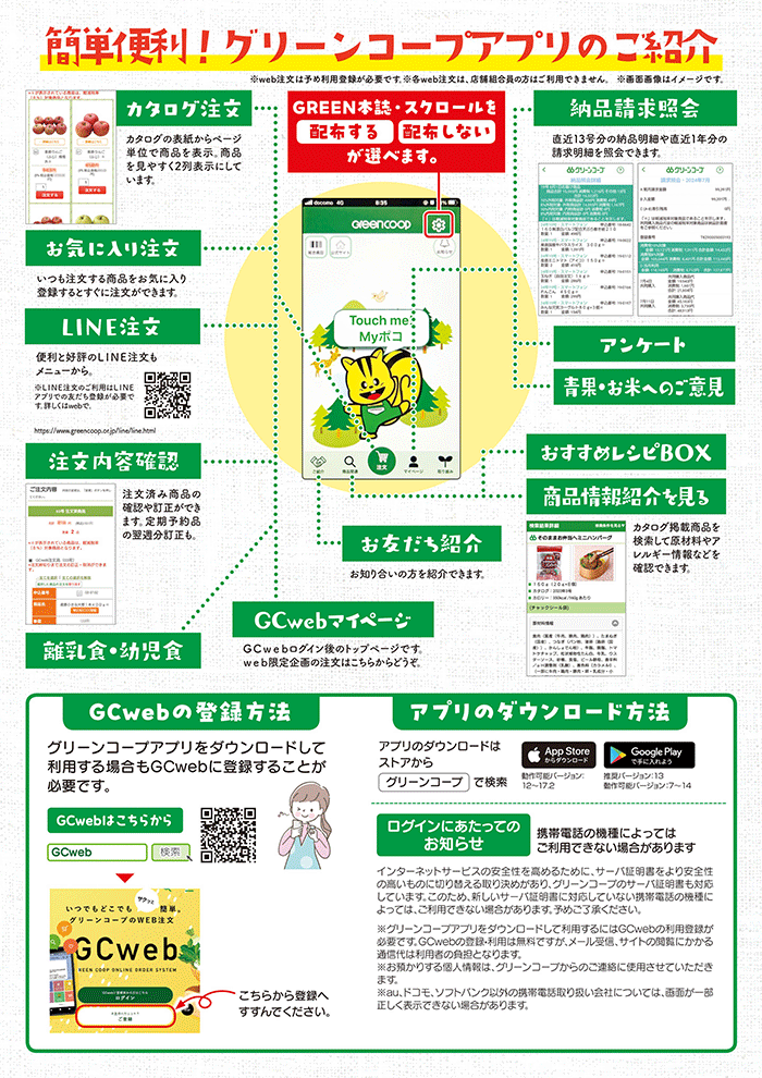 チラシ裏面には、GCwebやグリーンコープアプリの登録方法を紹介しています。まだご登録されていない方は、この機会にぜひお願いします。