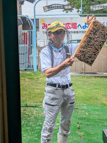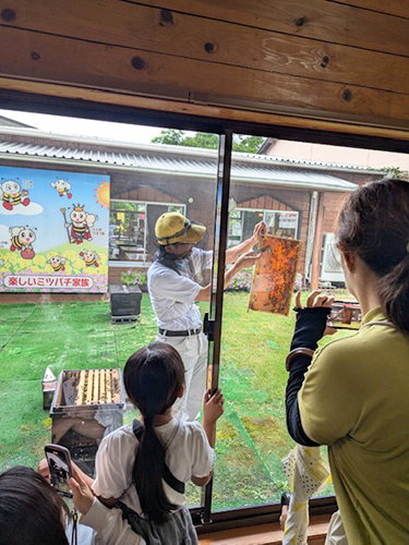 養蜂家からミツバチの生態を聞き、ミツバチも間近で観察。