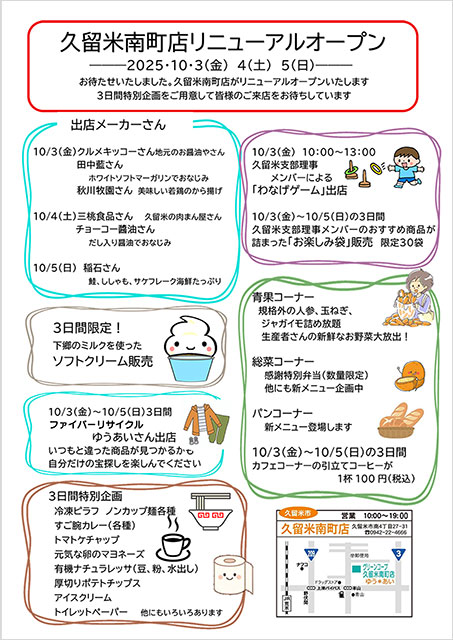 グリーンコープ生協ふくおかは久留米南町店をリニューアルしました。これを記念し、家族で楽しめるイベントを10月3日(金)、4日(土)、5日(日)の3日間にわたり開催します。