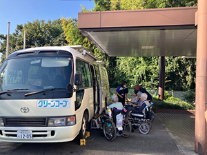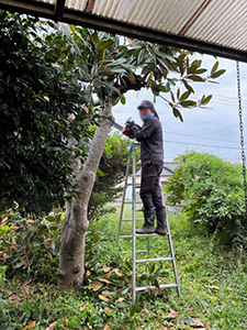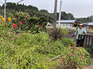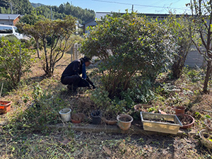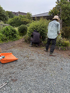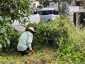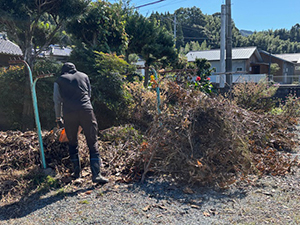 益城町でいつも元気カーを利用されている方の庭掃除支援をしました。高齢の方で、先日1人で作業されたら腰を痛めたそうで、お手伝いすることにしました。庭は雑草と木がうっそうとしている感じで、最初に大きい木の枝落としから草取り、剪定を行いました。3名で3時間程作業しましたが、半分も終わらない様子です。来週も時間を取って伺うようにします。