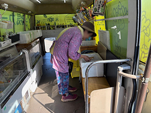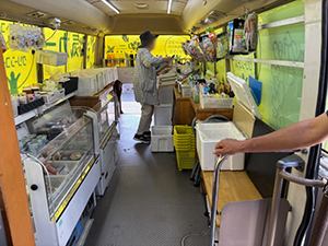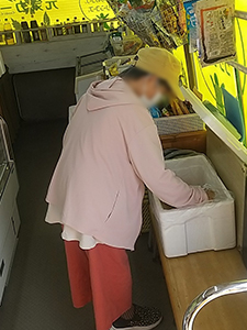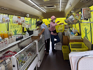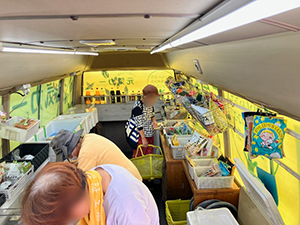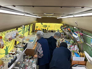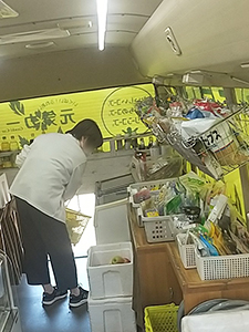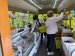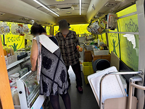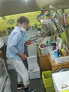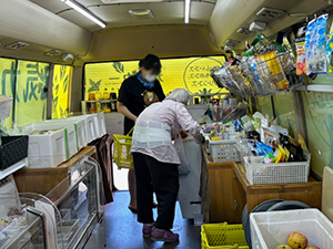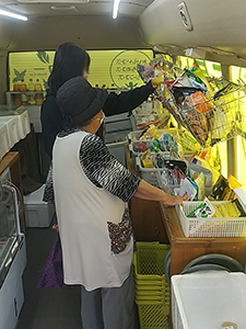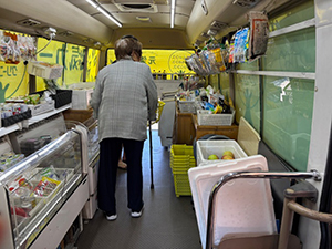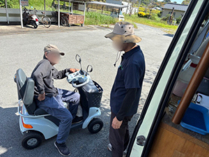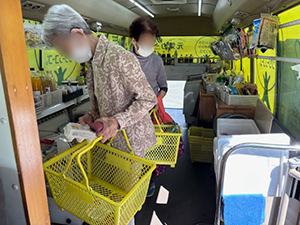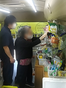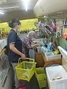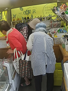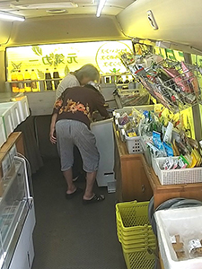 下田地区に到着すると、電動カーに乗った男性の方が待っておられました。「来ているのは知っていたけど初めて来た」と言われ、買い物をされました。後から来られた常連のおばあちゃんにお聞きすると顔を知らない方のようで、少し離れた地域から来られたようです。