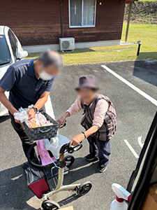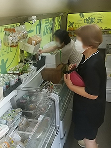 舞原第二団地では、いつもは訪問し注文を取ってお届けしている方が玄関前に出て、お友達とおしゃべりをしておられました。そこでお誘いしたところ、お二人でお買い物に来られました。目で見てのお買い物なのでいつも以上にお買い上げいただきました。