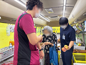 いこいの里では、水曜日に移動販売で伺っている宮園団地の方がデイサービスで来られています。「昨日は留守しとった」と来られ、規格外のりんごと惣菜を買われました。