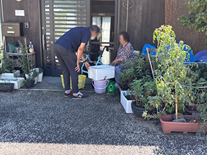 田原団地では、見守りしているおばあちゃんは到着すると玄関まで来られていました。よく来られるもう1名の方は、玄関先で「榊」を店に卸すために切って輪ゴムで縛っておられました。