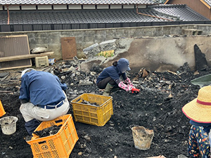 西原村で先週火事に遭ったお宅の片付けを手伝いに行きました。片付けの内容は焼け跡から金属、燃えるもの、瓦を分ける作業です。業者に依頼すると高額になるので近所の方が来られて作業されていました。瓦は思った以上に重く、破片をコンテナ半分ほどでも抱えきれないくらいでした。少しでもお役に立ててよかったです。