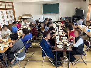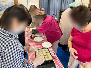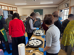 益城町でサロンを開催しました。地域のみなさんが30名ほど集まり、「たこやきと梅ヶ枝餅作り」をしました。