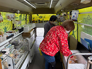宮山公民館では、到着すると近くの畑から男性の方が来られ「小腹が空いたので何かあるか見に来ました」と言われ、パンとお菓子を買って行かれました。時々来られるおばあちゃんがお惣菜を買いに来られました。近所の親子連れの方が来られ「先週も来たけどちょうど出発して間に合わなかった」と言われました。