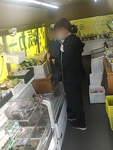 平田地区では到着するとおばあちゃんが待っておられました。時々調味料を買いに来る方で、醤油、酢を買われました。