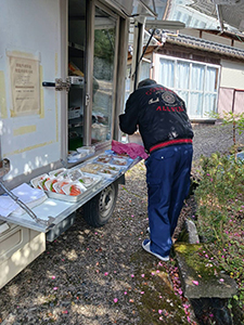 上原地区では、1か所目の方は、寒いからとはちみつ入りしょうが湯を購入されました。2か所目の方は予約された冷凍食品を購入され、3か所目の方は野菜などを購入されました。