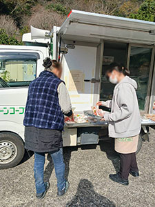 日隠地区では、3名の来店があり、野菜やたまご、パンを購入されました。お刺身、お惣菜も追加して買われました。冷凍うどんが欲しい方が数名おられましたので、次回お届けしたいと思います。