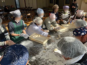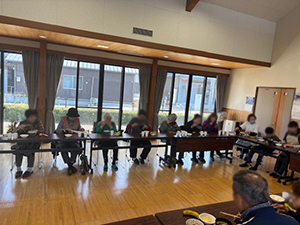 つながるカフェを開催しました。今回の参加者は16名でした。スタッフは組合員2名、災害支援センター4名です。恒例の門松作りは、みなさん慣れてこられたのでスムーズにできました。事故もなく良かったです。食事は炊き込みご飯と豚汁、果物を用意しました。みなさん「たくさん作るとおいしい」と言われ、ほとんどの方がおかわりされていました。喜んでいただけて良かったです。