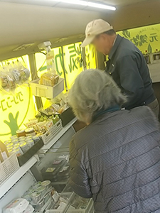 南阿蘇社協では、到着すると施設利用者の方たちが椅子に座って待っていました。その中の1人のおばあちゃんは漬物がお気に入りで2袋買われました。「この漬物はおいしい。1週間で1袋食べる」と話されました。切らさないようにしたいと思います。