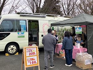 災害支援センターとして、いも天、ミニ肉まんの販売と、元気カーの展示紹介、一部(ドライ商品と規格外りんご)の販売をしました。