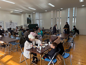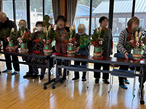 つながるカフェを開催しました。今回の参加者は16名でした。スタッフは組合員2名、災害支援センター4名です。恒例の門松作りは、みなさん慣れてこられたのでスムーズにできました。事故もなく良かったです。食事は炊き込みご飯と豚汁、果物を用意しました。みなさん「たくさん作るとおいしい」と言われ、ほとんどの方がおかわりされていました。喜んでいただけて良かったです。