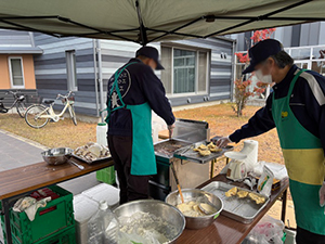 益城町地域団体合同イベントに参加しました。これは益城町で活動している団体の紹介の場になります。商品の販売や団体の活動の紹介等様々です。災害支援センターは益城町東無田で栽培したさつまいもを使ったいも天とグリーンコープの肉まん、パオズの販売をしました。天気は良かったのですが、来客が昨年半分程でした。同じ日に木山川沿いでマルシェが開催されていてそちらに行かれた方も多かったそうです。販売については肉まんとパオズ、いも天は好評でした。どれも熱々を食べられた方は「おいしい」と言っていただきリピートされた方もいらっしゃいました。